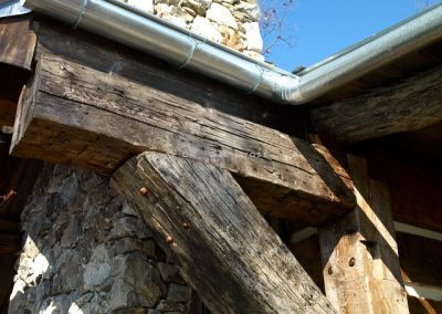 Massive, hand hewn beams are overhead from the kitchen to the living room area.