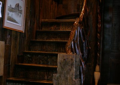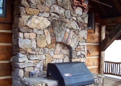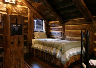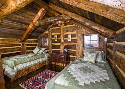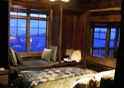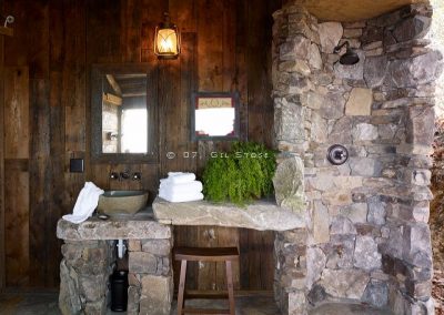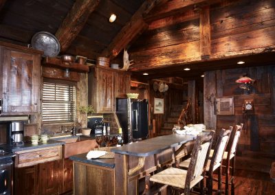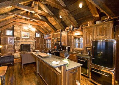 With 15′ ceilings, the cabin’s massive beams and woodwork command attention from the the rustic soapstone countertops.