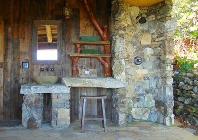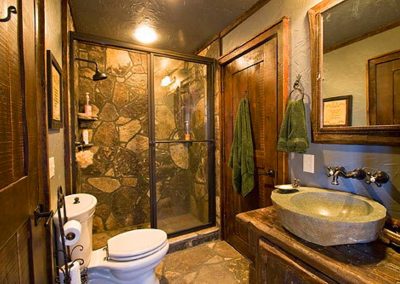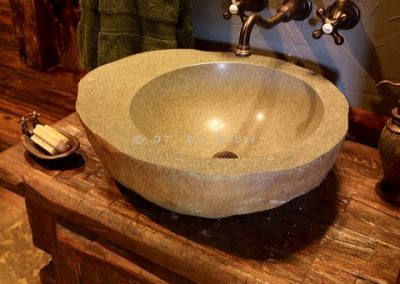 The granite bathroom sink sits on an antique wood, hand crafted cabinet.