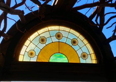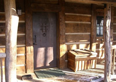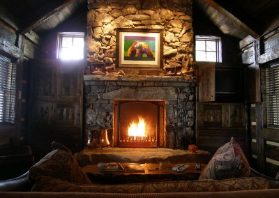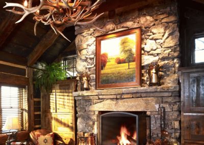 The elk antler-shed chandelier presides over a mammoth 7’x3’x15″ solid granite slab, fireplace hearth.