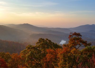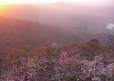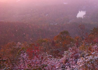An early dusting of snow plus the autumn colors casts a pink hew at sunrise.